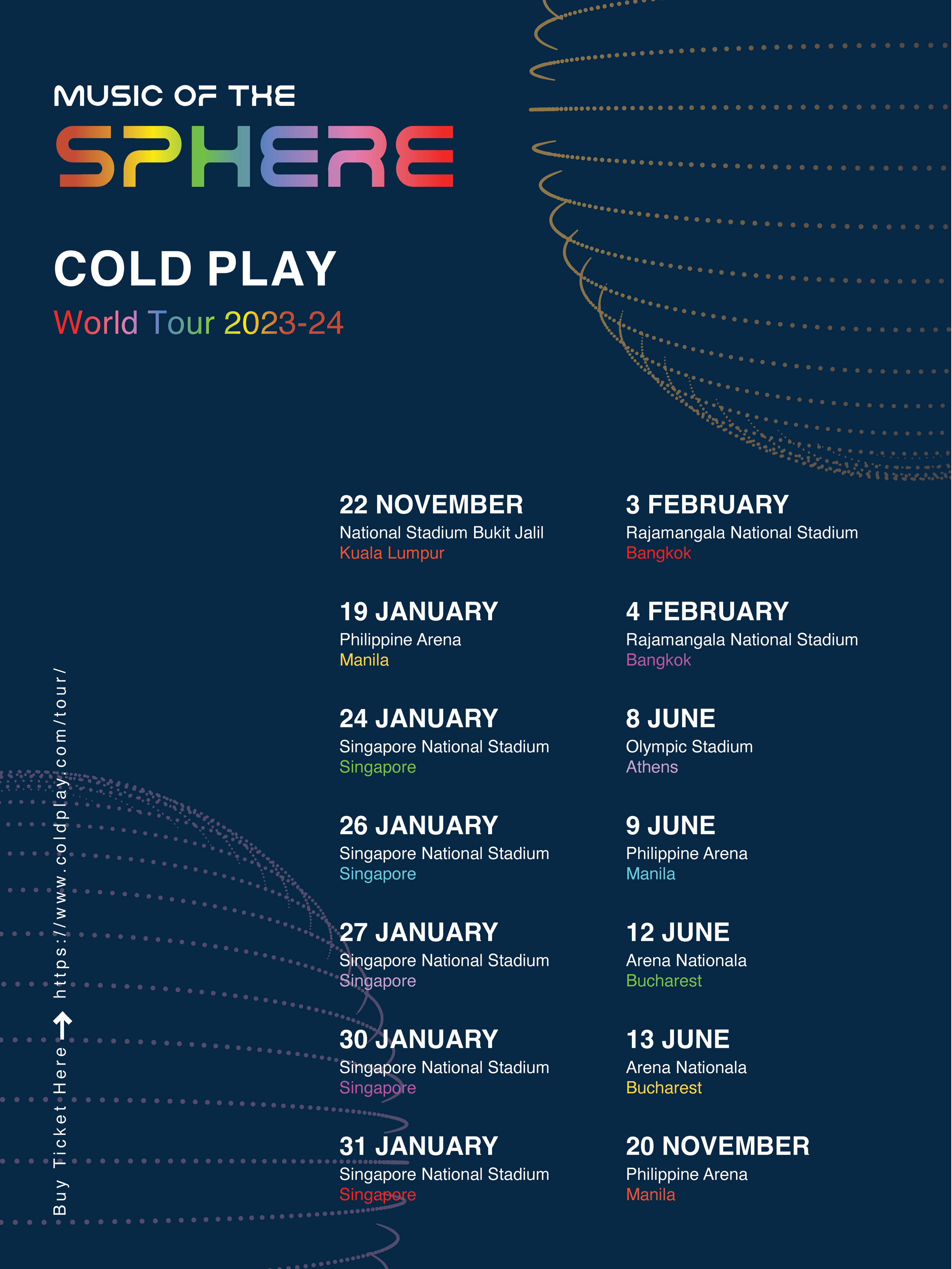 To keep a hint of the "Music of the Spheres" theme, I added a dotted arc that looks like a planet's orbit but doesn’t overpower the design. I used a colorful font for the word "SPHERE" to connect with Coldplay's usual style, but kept it limited to just that word to maintain a clean and modern look.
