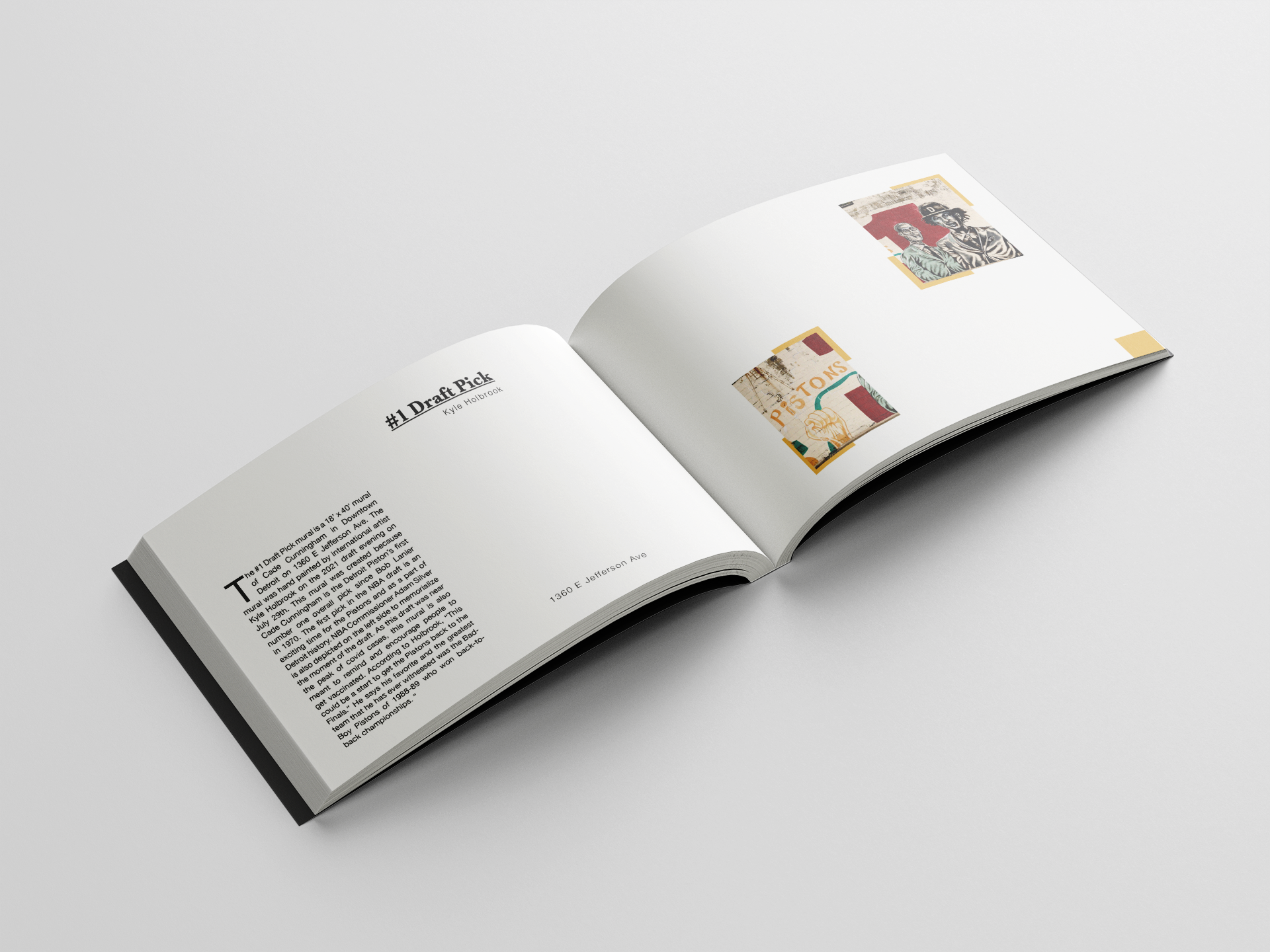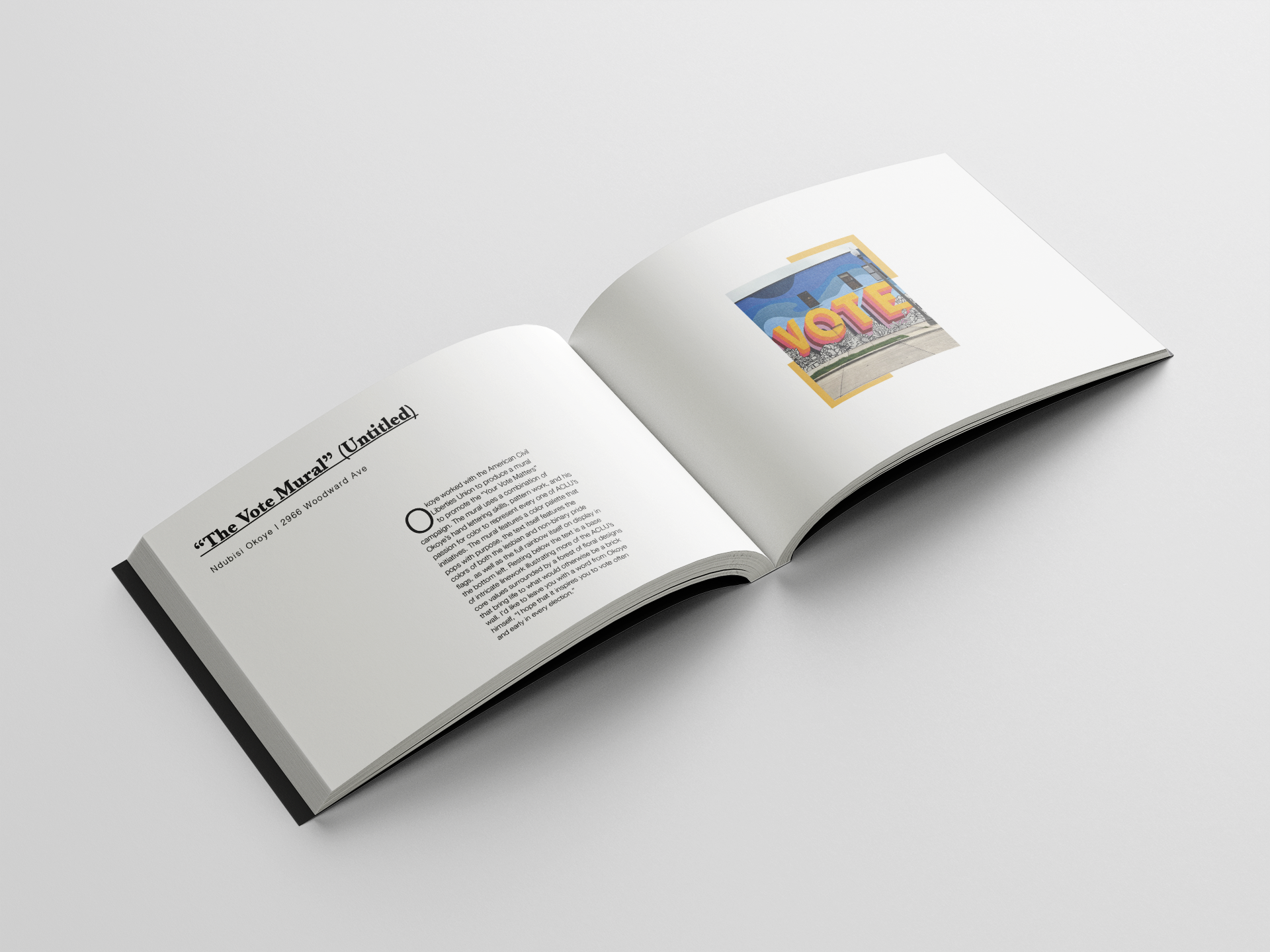 I created this book to give visitors a glimpse into the vibrant and colorful spirit of Detroit. It features murals from across the city, along with information about each piece and its exact location. A map is included to highlight the distance between the murals, helping readers navigate the art trail. Green and gold design elements pay tribute to Wayne State University, where this book was created, and the clean layout reflects my personal design style.