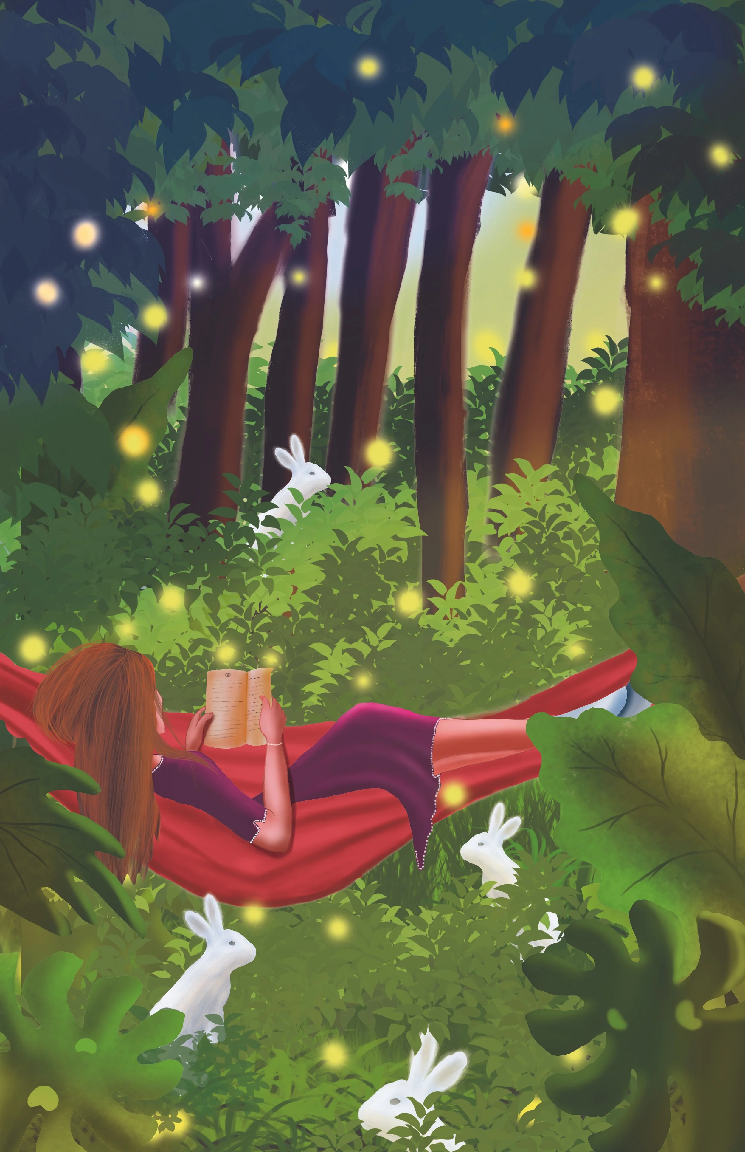 I created for a class assignment, this illustration imagines my dream escape—a serene forest glowing with fireflies, curious rabbits, and a cozy hammock beneath the trees. It’s a peaceful sanctuary where imagination and tranquility meet.