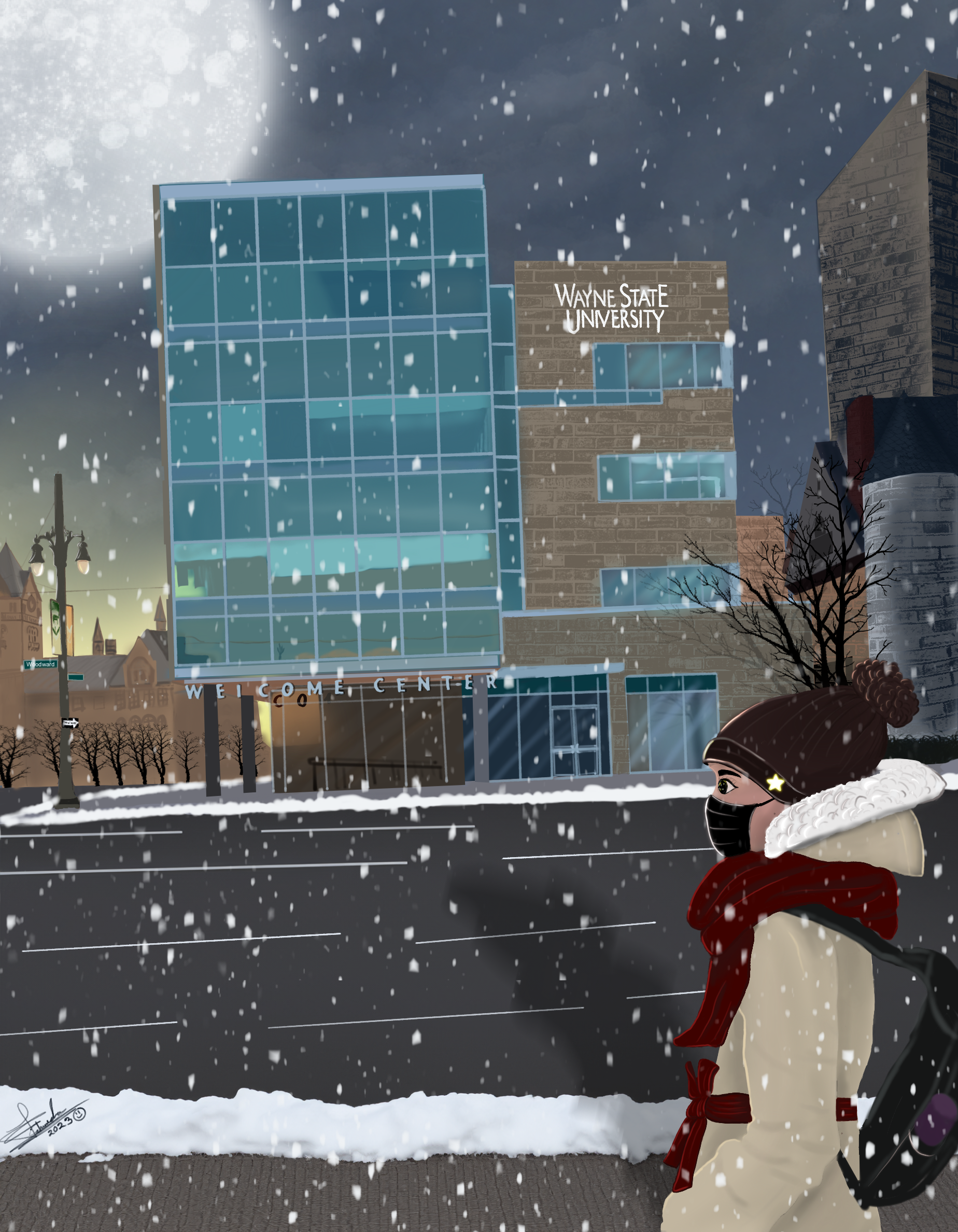 A serene scene of Wayne State University’s campus, capturing the quiet beauty of a snowy evening. Inspired by a moment of reflection while waiting for the bus across from the Welcome Center.