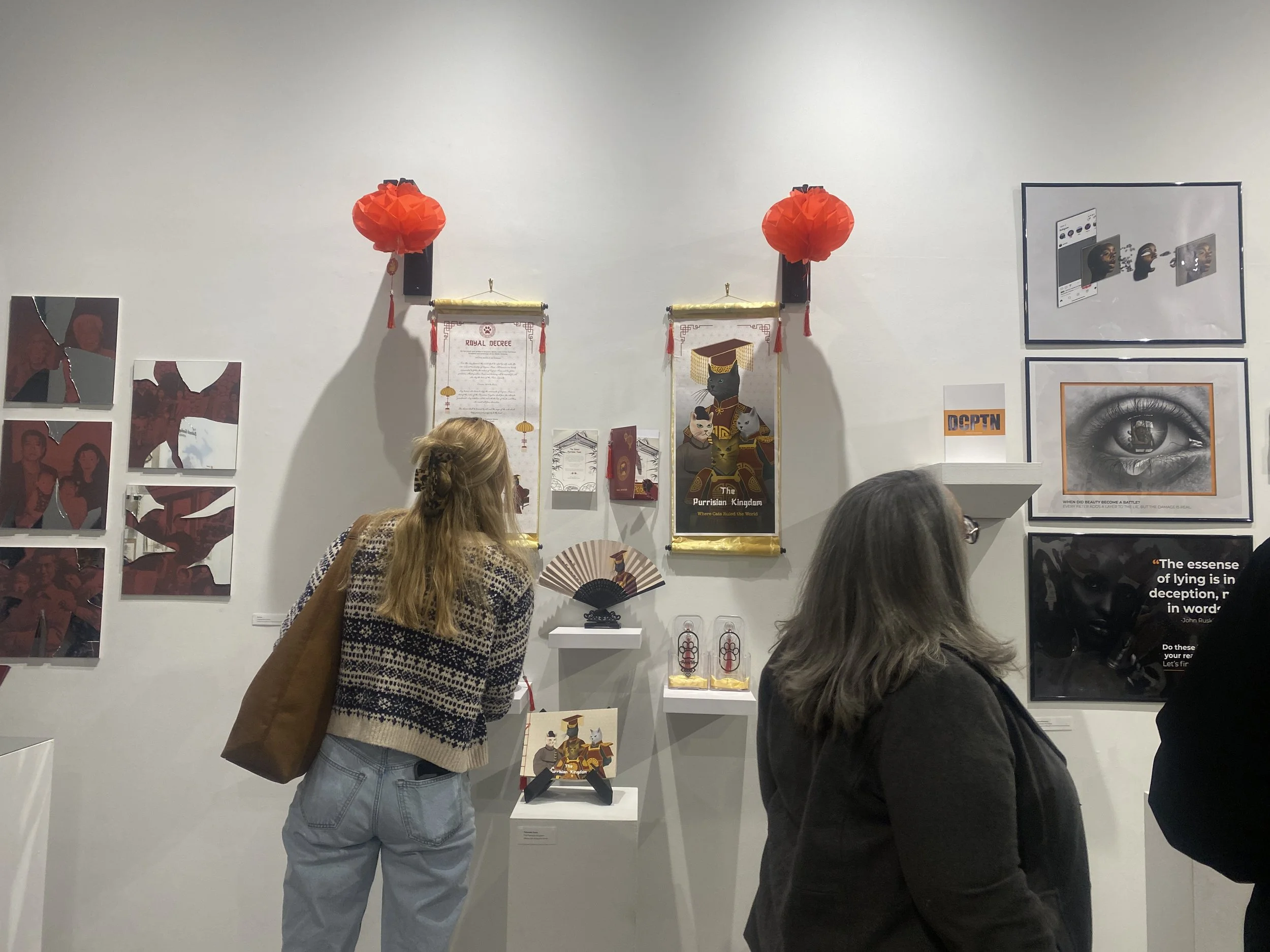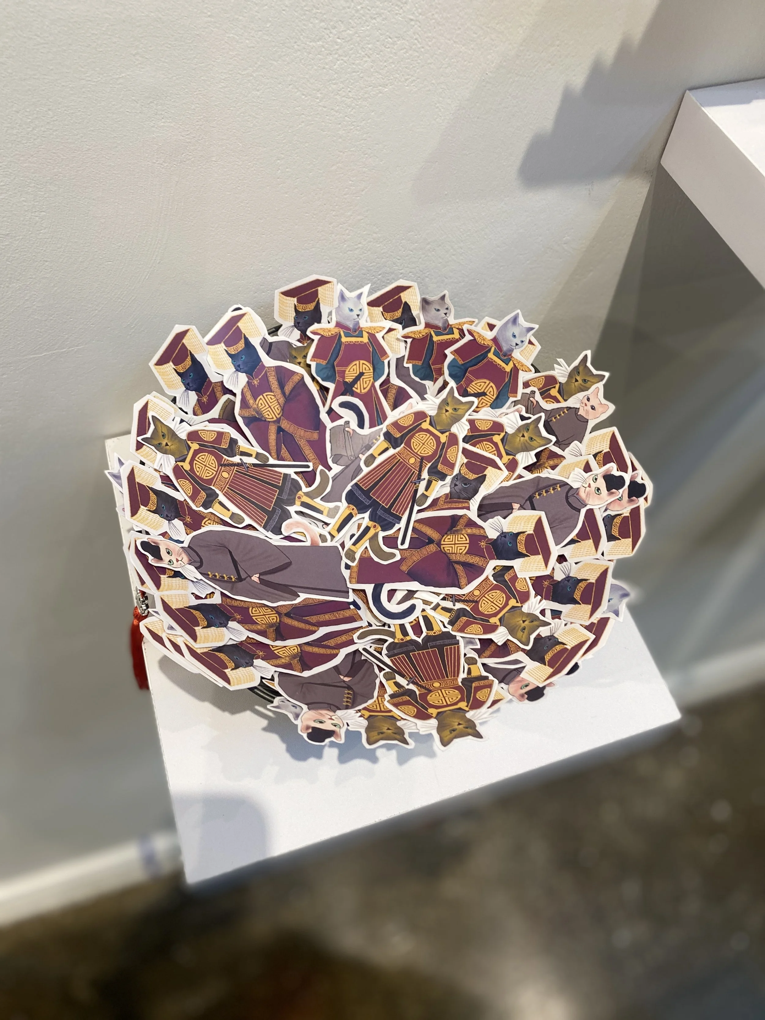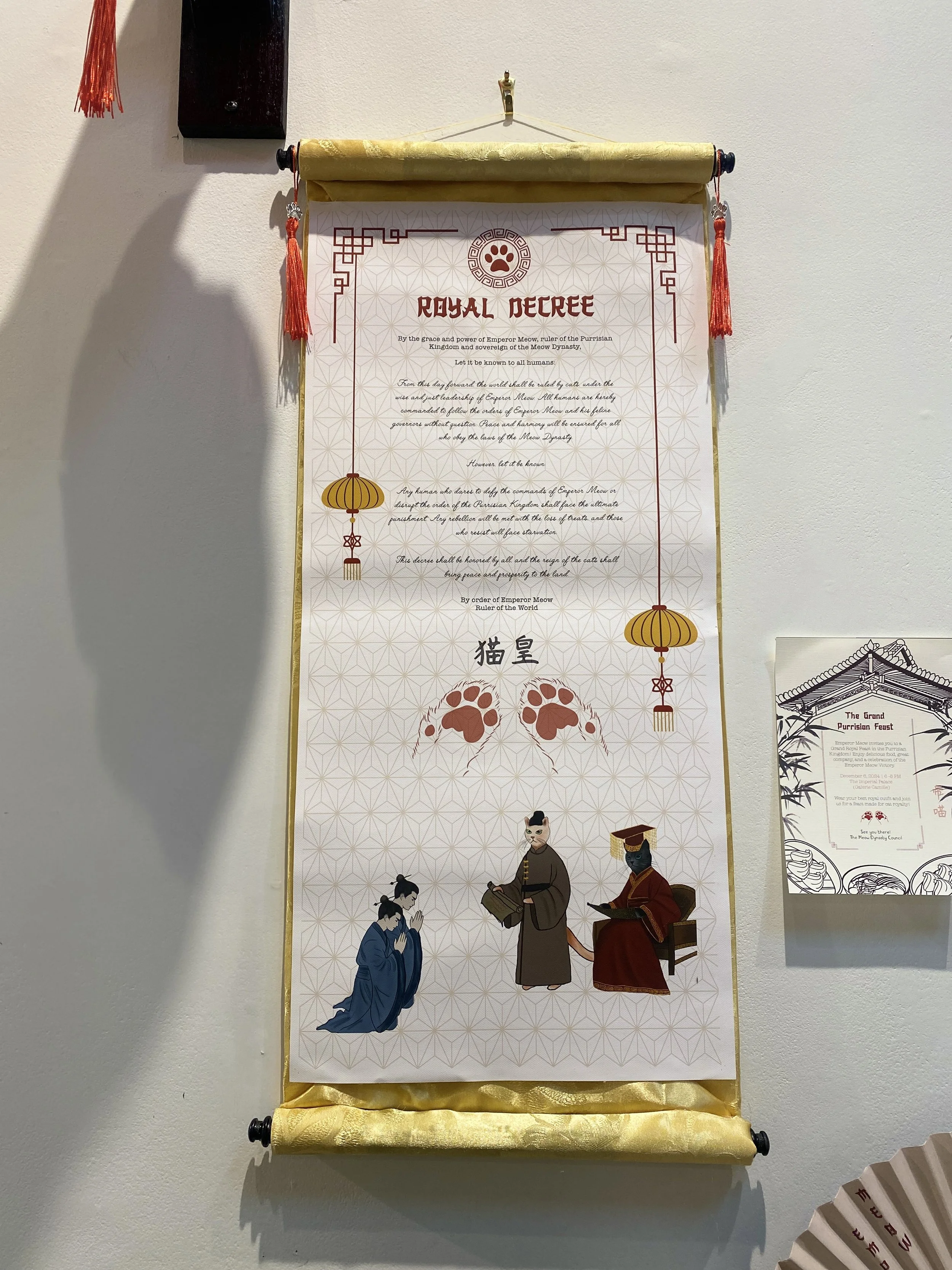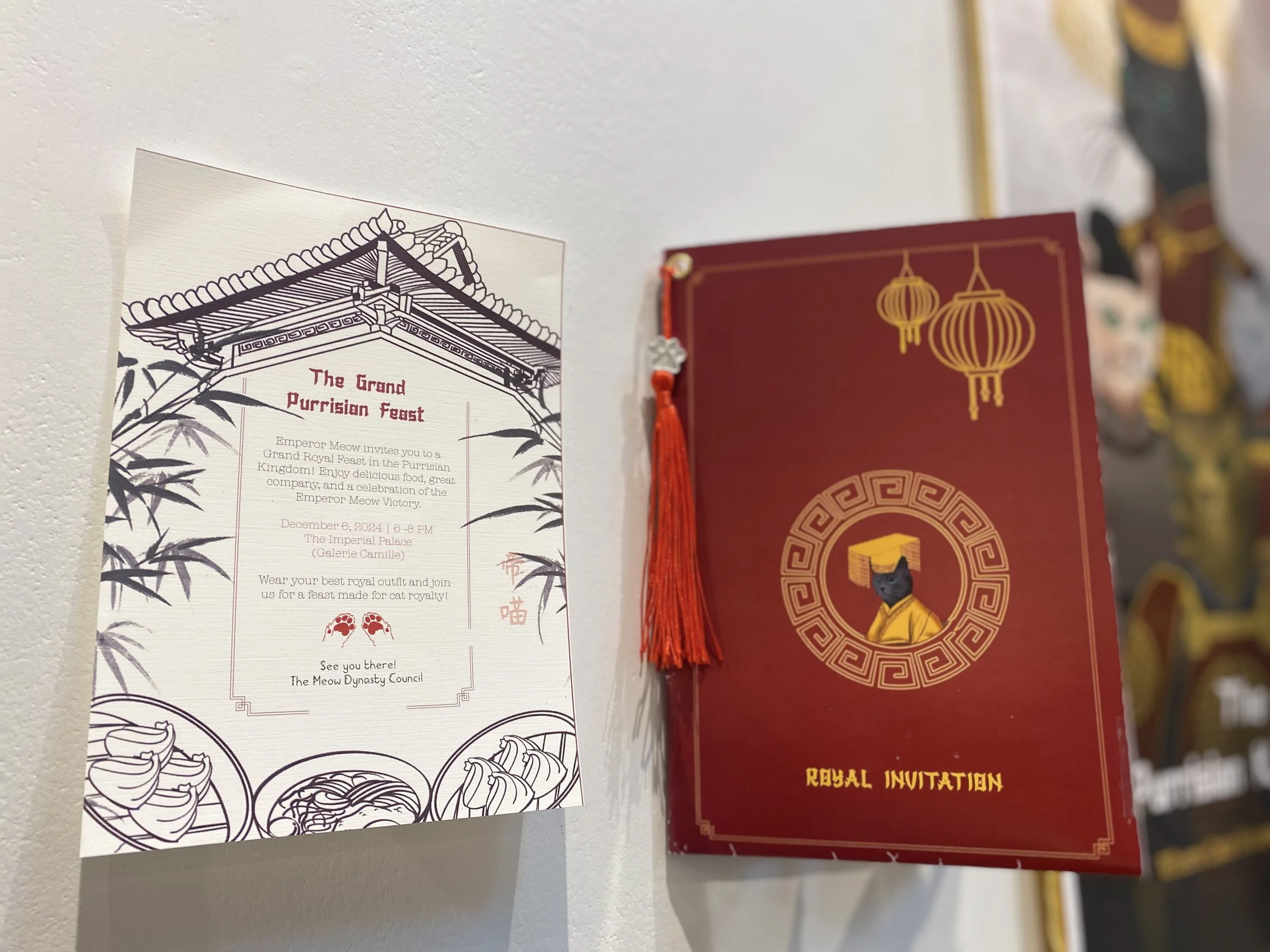 The Purrisian Kingdom: Where Cats Ruled the World envisions a fictional era, the Meow Dynasty, where cats have replaced humans as rulers, blending traditional Chinese culture with feline symbolism. This project reimagines cats’ mysterious and powerful role in shaping history, featuring elements of Chinese architecture, costumes, patterns, and colors. Using Chinese fabrics, fans, and original illustrations, I’ve created a visual archive that explores how cultural aesthetics can build unique historical narratives. The project highlights new possibilities for speculative design and world-building, offering fresh perspectives on storytelling through imaginative design.